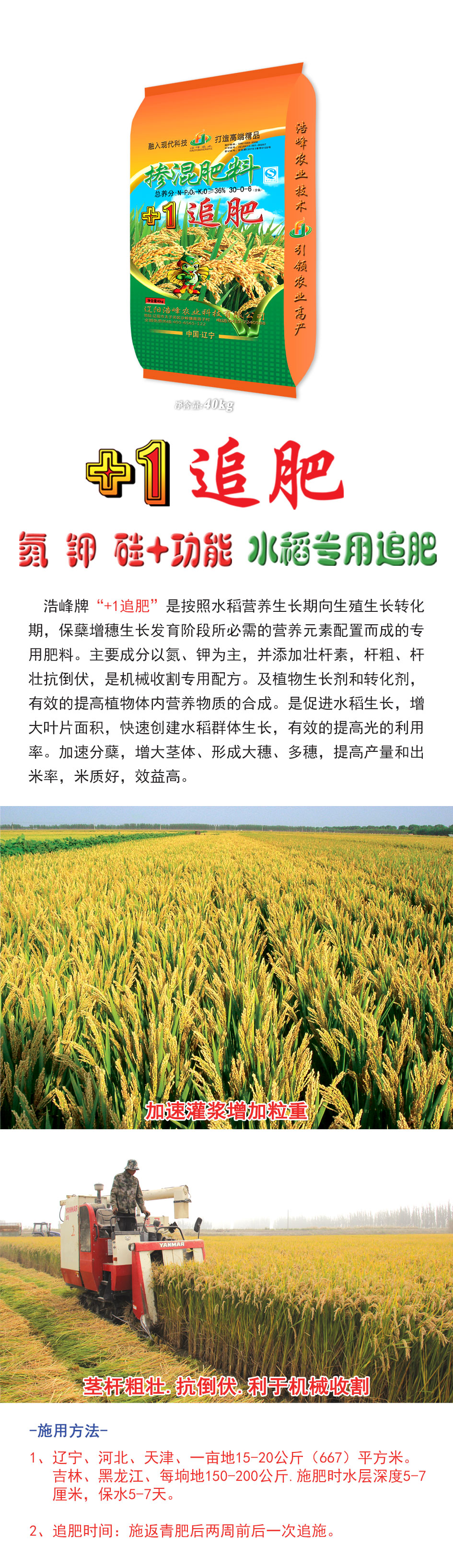 浩峰牌“+1追肥”是按照水稻營(yíng)養(yǎng)生長(zhǎng)期向生殖生長(zhǎng)轉(zhuǎn)化期,保蘗增穗生長(zhǎng)發(fā)育階段所必需的營(yíng)養(yǎng)元素配置而成的專(zhuān)用肥料。主要成分以氮、鉀為主,并添加壯桿素,桿粗、桿壯抗倒伏,是機(jī)械收割專(zhuān)用配方。及植物生長(zhǎng)劑和轉(zhuǎn)化劑,有效的提高植物體內(nèi)營(yíng)養(yǎng)物質(zhì)ず銑傘J譴俳舊?,札e笠鍍婊?,繝F俅唇ㄋ救禾逕ぃ行У奶岣吖獾睦寐?。尖欃分蘖,札e缶ヌ?、芯暭嗴穗、多穗,提高产量航y(tǒng)雒茁剩字屎?,效益高?